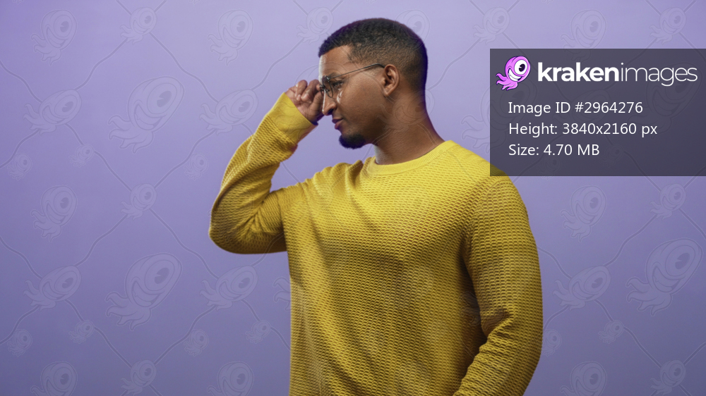 Young black man adjusting glasses with hand, wearing a yellow sweater, neutral pose in studio; thoughtful focus.