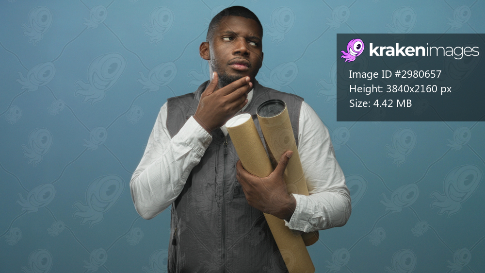 Young black man architect holding rolled blueprints and plan tubes while touching chin in studio; thoughtful planning.