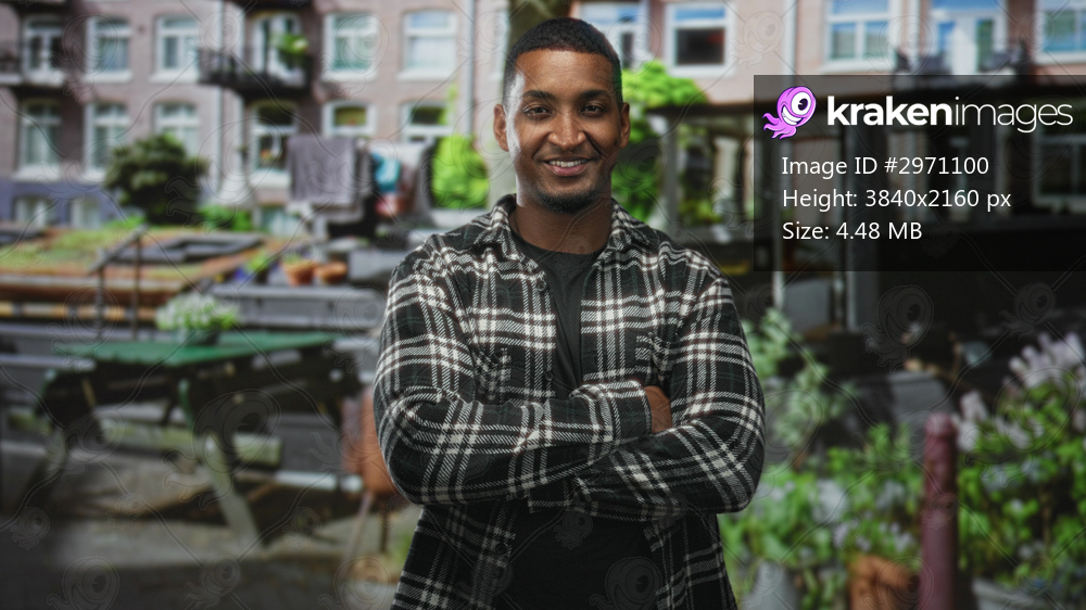 Young black man with arms crossed wearing a black and white plaid shirt on street beside canal houseboats, outdoor tables and potted planters, smiling; confidence casual ease. - Kraken Images