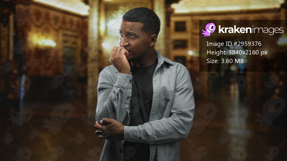 Young black man bites fingernail, hand to mouth, standing in ornate building foyer; anxiety introspection.