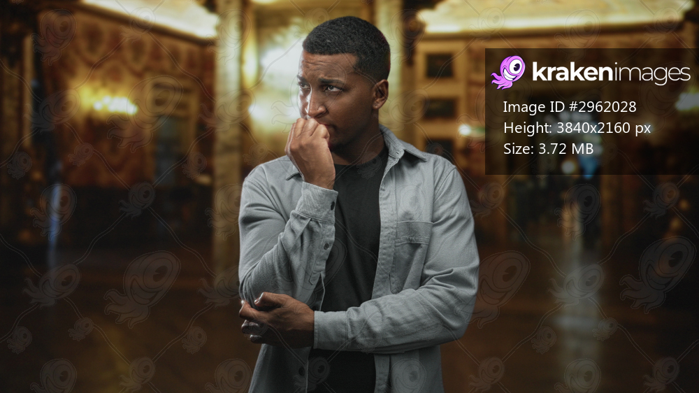 Young black man bites fingernail, hand to mouth, standing in ornate building foyer; anxiety introspection.
