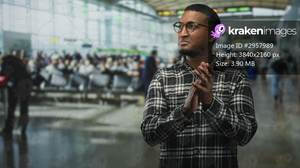 Young black man claps hands in airport terminal wearing glasses and plaid shirt; celebration gratitude.