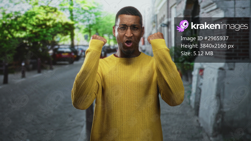 Young black man clenches fists on a city street wearing yellow sweater and glasses before a brick building; confidence determination.