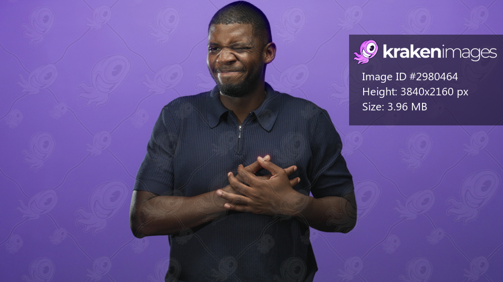 Young black man clutching hands to chest in studio with wince and strained grimace signaling possible heartattack or chest pain; pain.