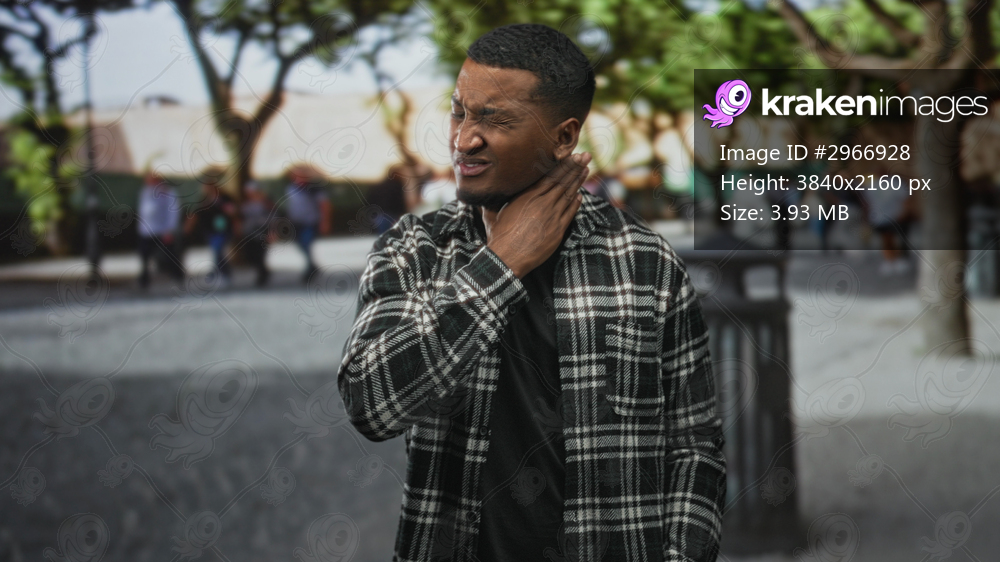 Young black man clutching his neck and grimacing while standing on a city street near a trash bin and trees; pain concern.