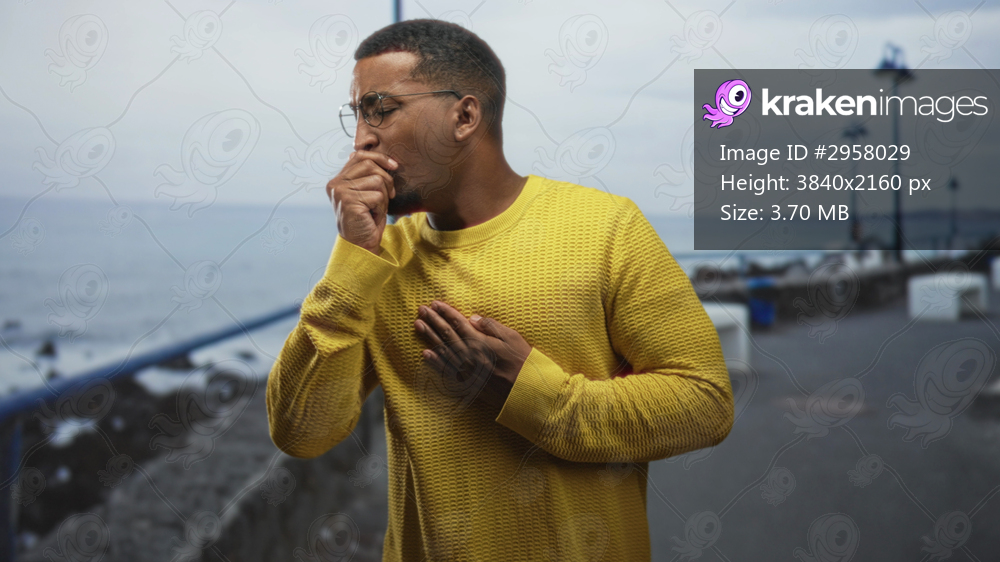 Young black man coughing into hand on street by the sea in yellow sweater, holding chest; health concern.