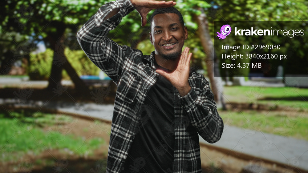 Young black man framing his face with both hands and smiling toward camera in forest path; playful confidence.