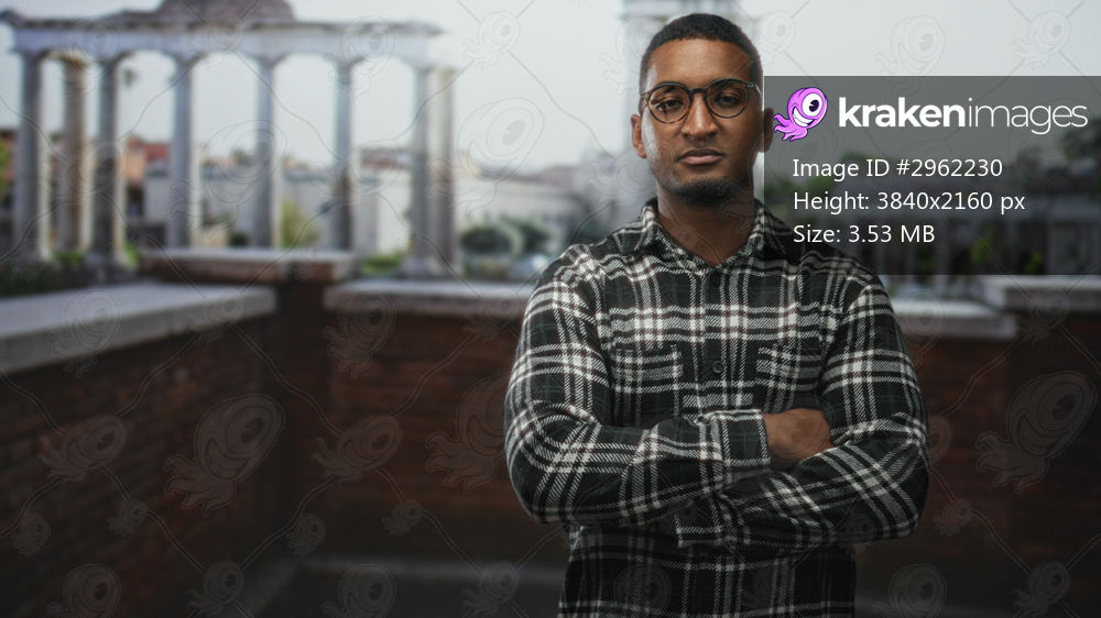 Young black man with glasses and arms crossed on building rooftop by brick railing, facing camera; confidence contemplation focus.
