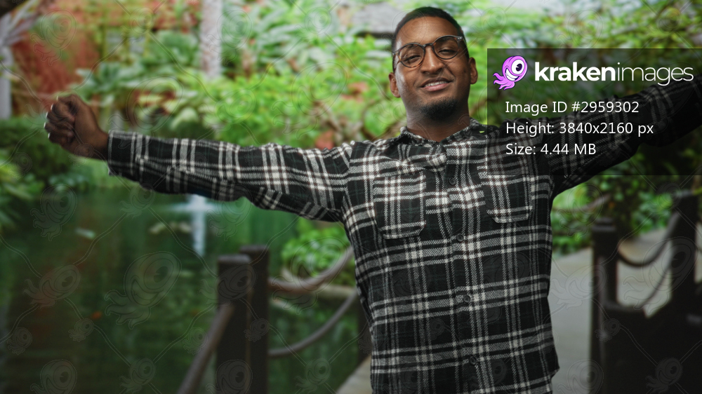 Young black man with glasses in plaid shirt stretches arms and smiles beside a pond and wooden railing in a forest; carefree joy.