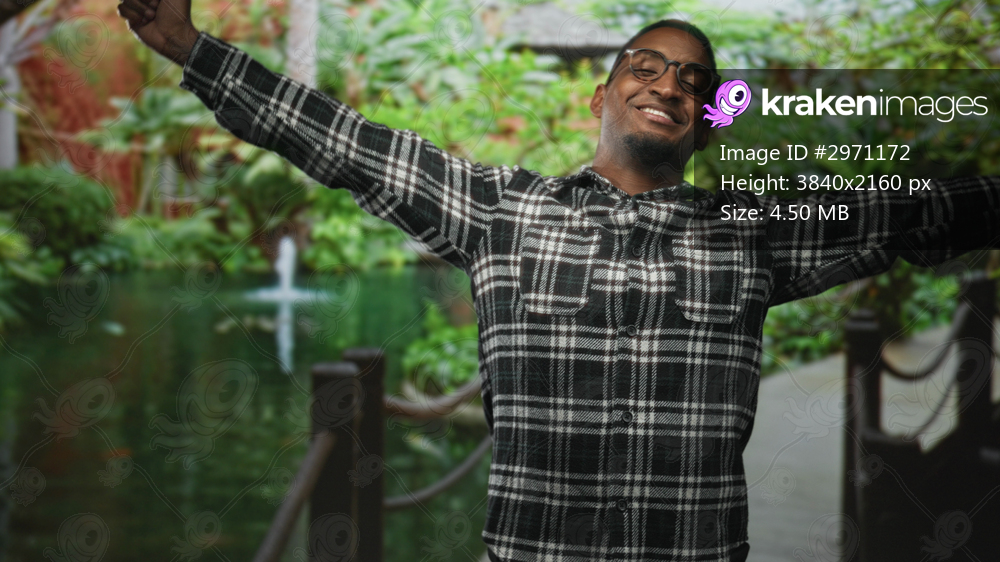 Young black man with glasses in plaid shirt stretches arms and smiles beside a pond and wooden railing in a forest; carefree joy.