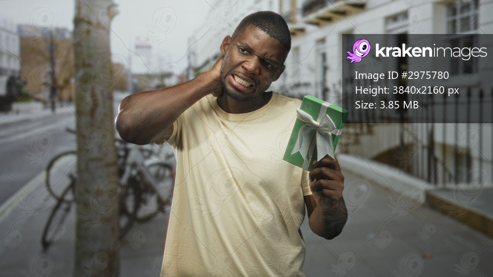 Young black man grimacing, holding a green gift box with hand on neck on street near bicycles and white building facades; pain frustration.