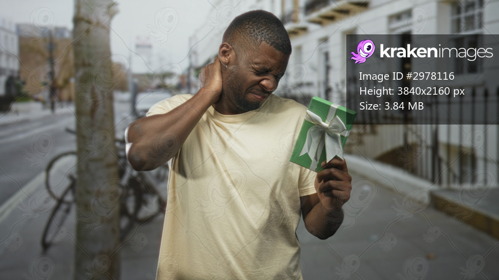 Young black man grimacing, holding a green gift box with hand on neck on street near bicycles and white building facades; pain frustration.