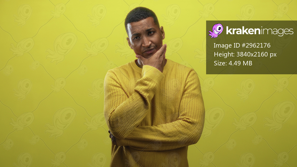 Young black man hand on chin in yellow sweater thinking pose in studio; introspection contemplation calm.