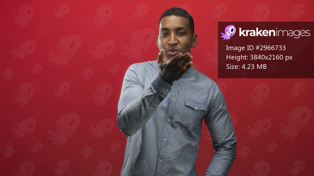 Young black man with hand to lips blows a kiss, covers mouth and points with fingers in a red studio; affection connection.