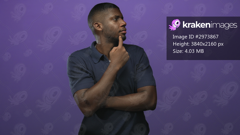 Young black man with hand touching chin and crossed arms, navy polo against purple studio backdrop; thoughtful reflection.