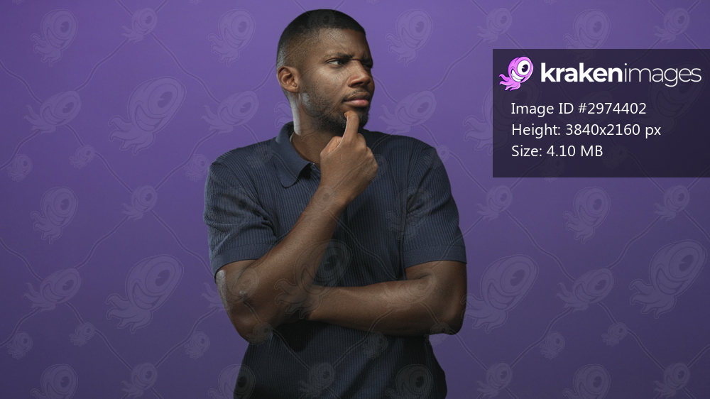 Young black man with hand touching chin and crossed arms, navy polo against purple studio backdrop; thoughtful reflection.