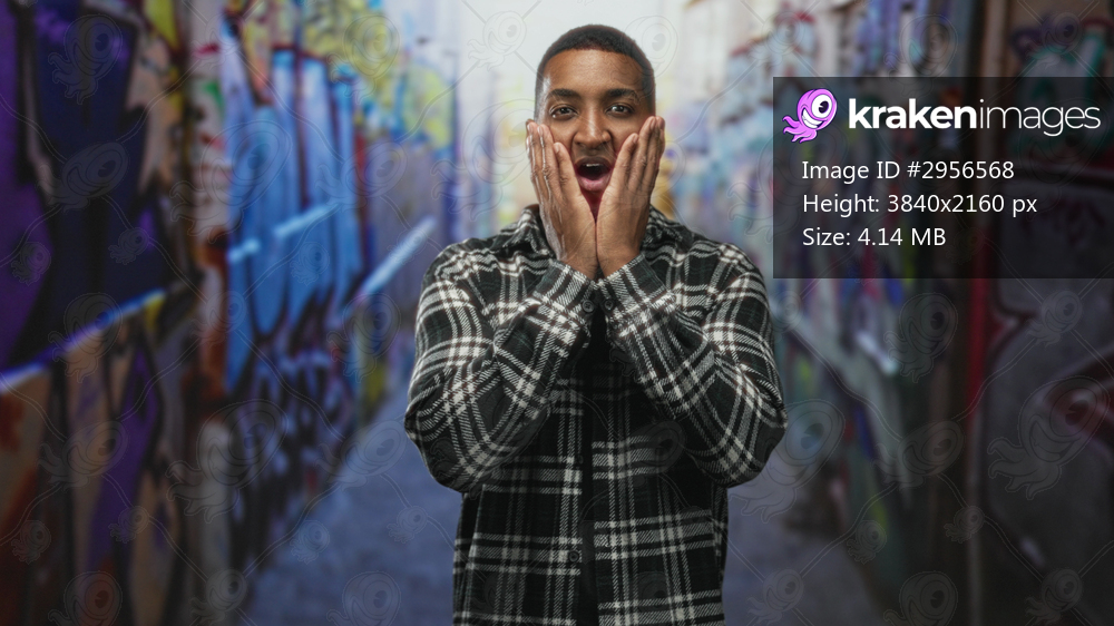 Young black man with hands on cheeks touching face, centered in a narrow graffiti lined street corridor wearing plaid shirt and black tee; surprise.