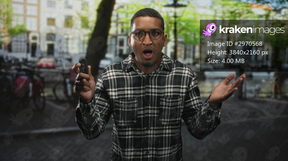 Young black man holding a car key fob and raising one hand in a questioning palm up gesture on a street canal; surprise inconvenience.