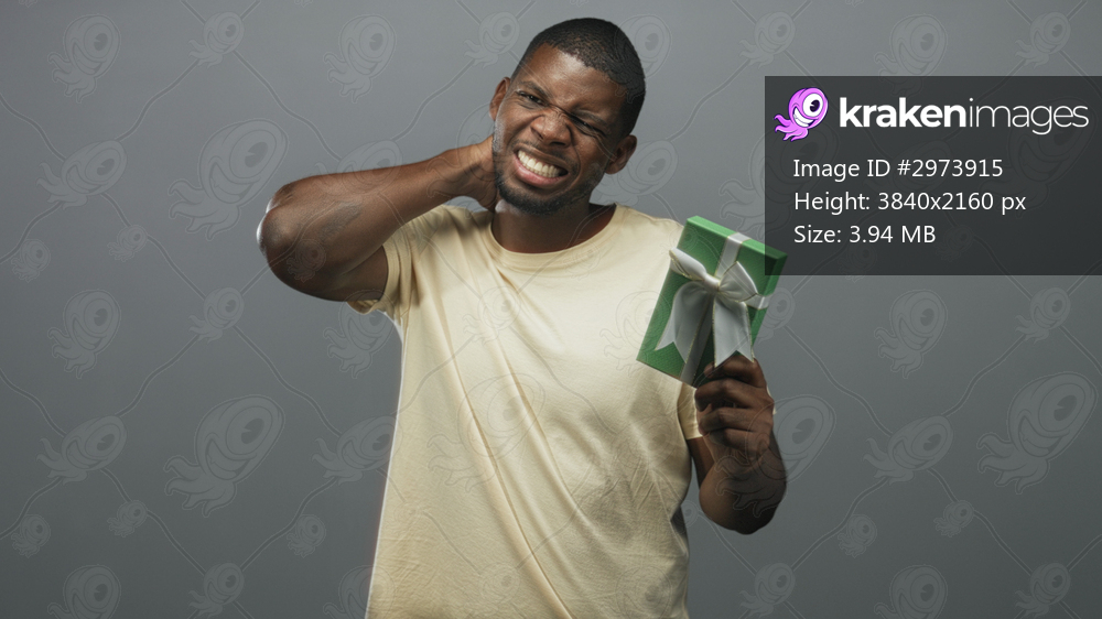 Young black man holding a green gift box with ribbon, rubbing his neck and grimacing in a gray studio; surprise pain.