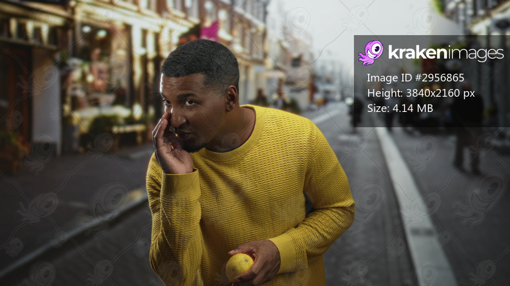 Young black man holding a lemon in his hands, hand near ear in a street market wearing a yellow sweater; casual curiosity.