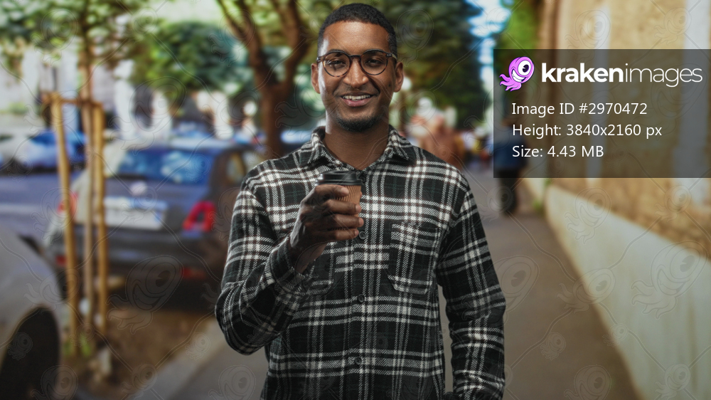 Young black man holding coffee cup in hand standing on street near parked car and sidewalk wearing glasses and plaid shirt; confidence ease.