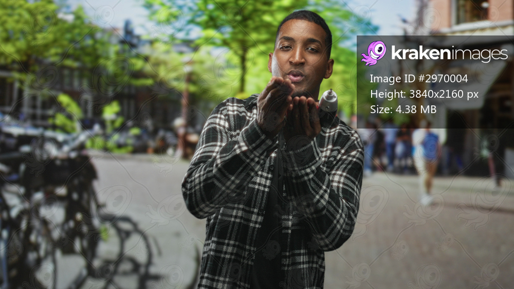 Young black man holding electric screwdriver and blowing a kiss with both hands while wearing a black plaid shirt near parked bicycles on a busy street; playful flirtation. - Kraken Images