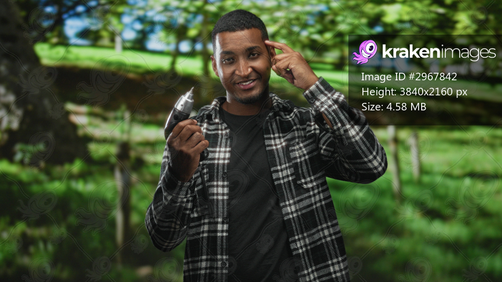 Young black man holding electric screwdriver and points finger to temple in forest near wooden fence; thoughtful diy repair.