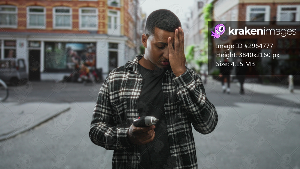 Young black man holding electric screwdriver and showing open palm while inspecting tool on an urban street, plaid shirt and furrowed brow; frustration. - Kraken Images