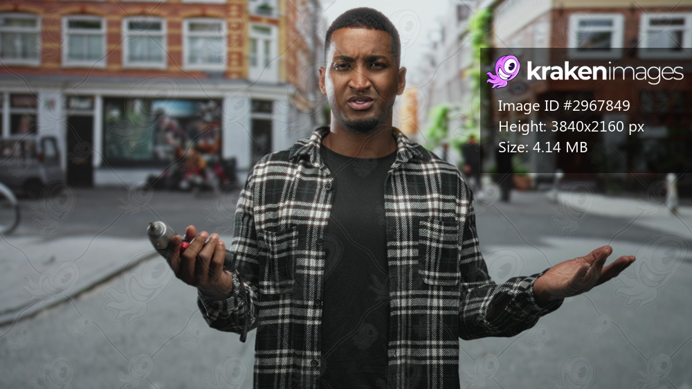 Young black man holding electric screwdriver and showing open palm while inspecting tool on an urban street, plaid shirt and furrowed brow; frustration. - Kraken Images