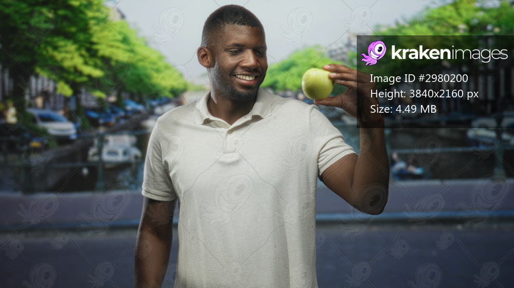Young black man holding green apple in hand, smiling on a street by a canal with trees and parked cars; healthy joy.