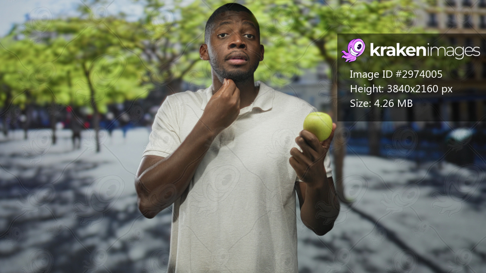 Young black man holding green apple and touching chin on a busy street plaza with trees and buildings; contemplation choice.
