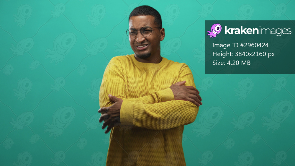 Young black man holding his shoulder and hugging chest, wearing yellow sweater and glasses in studio with teal backdrop; discomfort vulnerability.