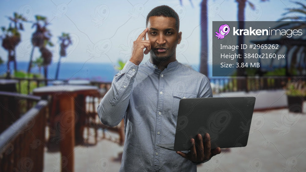 Young black man holding laptop and pointing finger to temple on a building balcony by the ocean with palm trees; focused remote work.