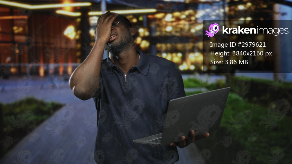 Young black man holding laptop and rubbing back of neck while grimacing in front of a lit modern building; frustration overtime.