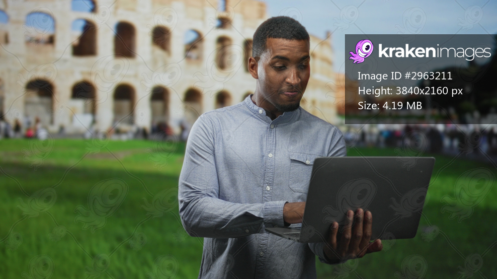 Young black man holding laptop and typing with right hand in front of historic building; curiosity learning growth.