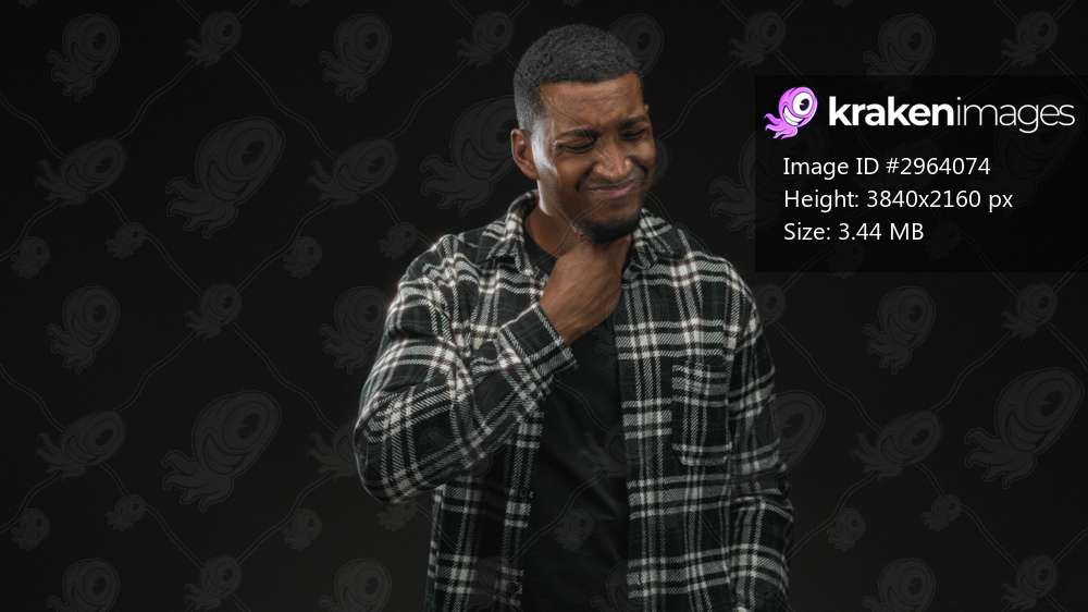 Young black man holding neck with hand and wincing, wearing plaid shirt in a dark studio setting; pain concern.