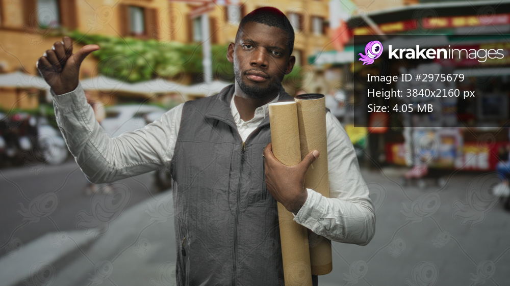 Young black man holding rolled architectural blueprints, thumb pointing to chest, standing on street in front of shops; confidence ambition.