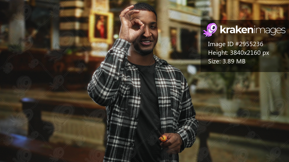 Young black man holding screwdriver in his right hand and forming ok sign with left hand near pews inside ornate building; confidence repair.