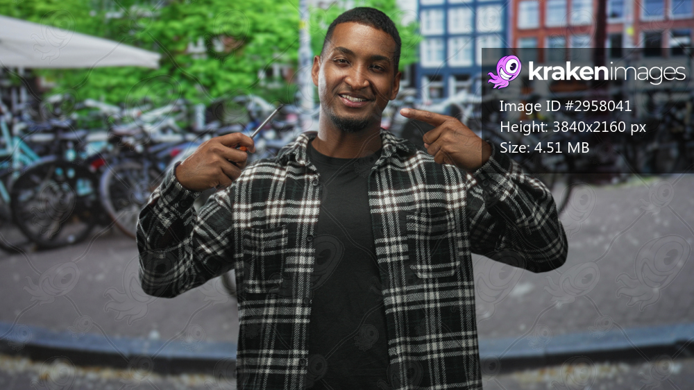 Young black man holding screwdriver and pointing finger at chest on street with bicycle racks and buildings visible; confidence skill readiness.