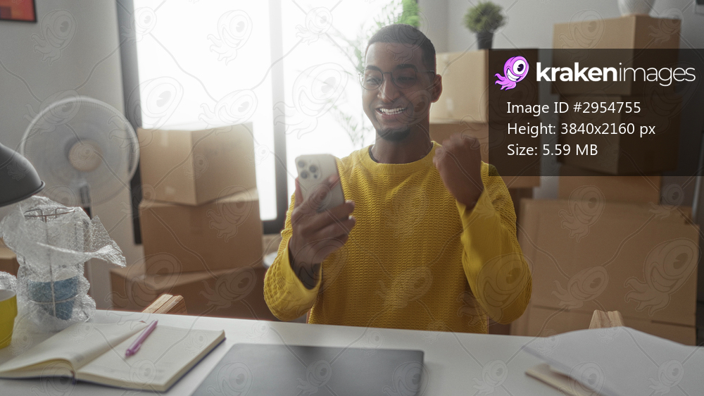 Young black man holding smartphone and pumping fist amid cardboard boxes in building; joy new beginnings.