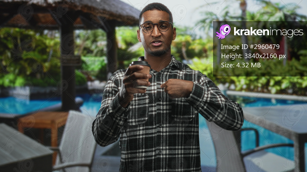 Young black man holding takeaway coffee cup and pointing to his chest in a poolside building with cabana and chairs; coffee morning relaxed.