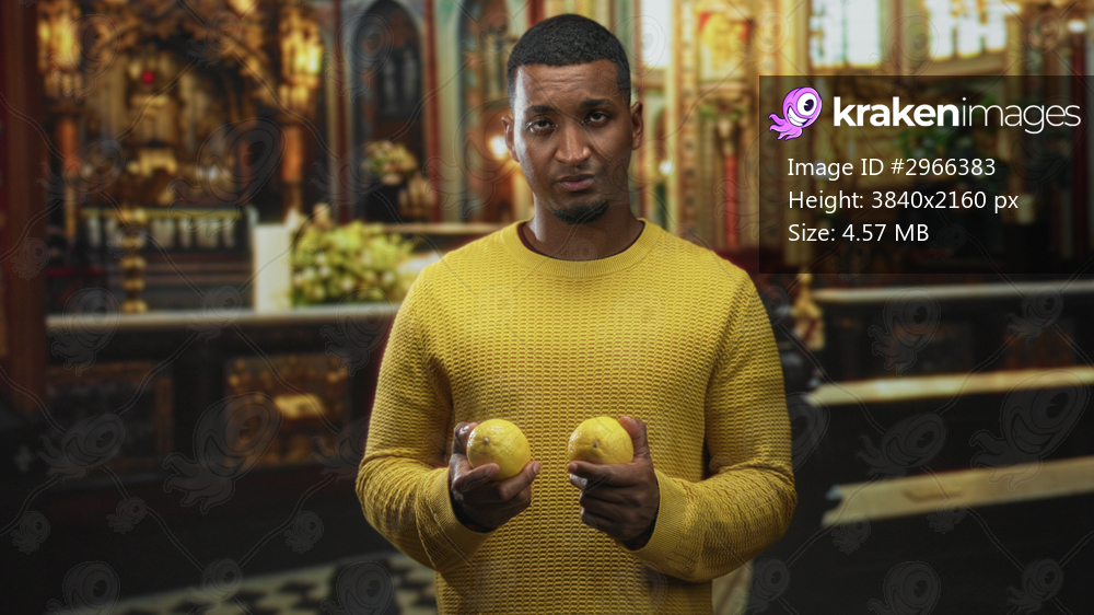 Young black man holding two lemons with bare hands in an ornate building altar setting; serene reflection.