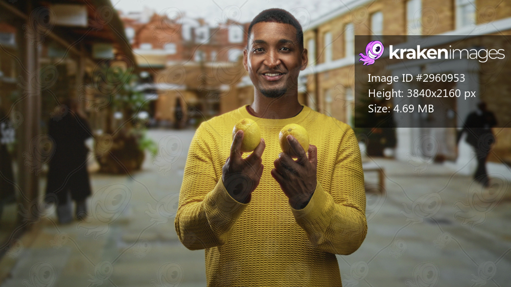 Young black man holding two lemons in hands on street while inspecting the fruit in a yellow sweater; curious casual moment.