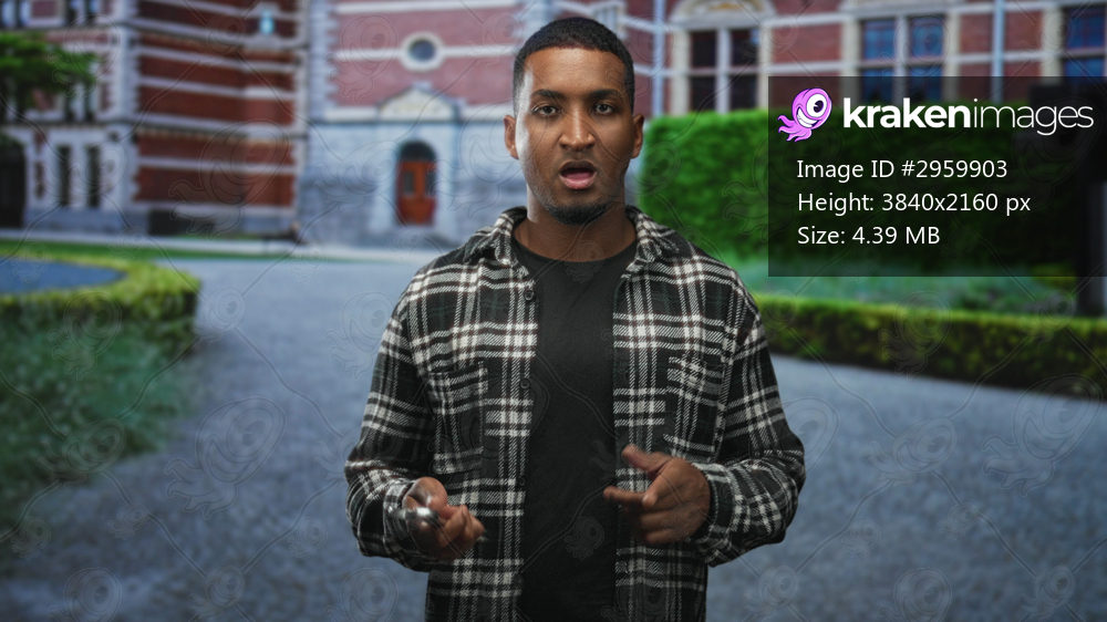 Young black man holding wrench with hand to forehead in campus building courtyard; thoughtful reflection.