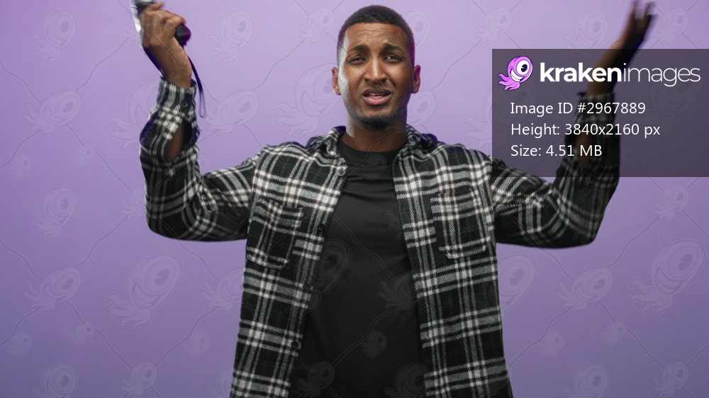Young black man holds electric screwdriver and raises hands to head in studio, furrowed brow and frustrated expression; frustration repair.