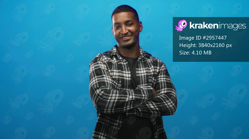 Young black man in black and white plaid flannel shirt with arms crossed, smiling in a studio blue backdrop; confidence.