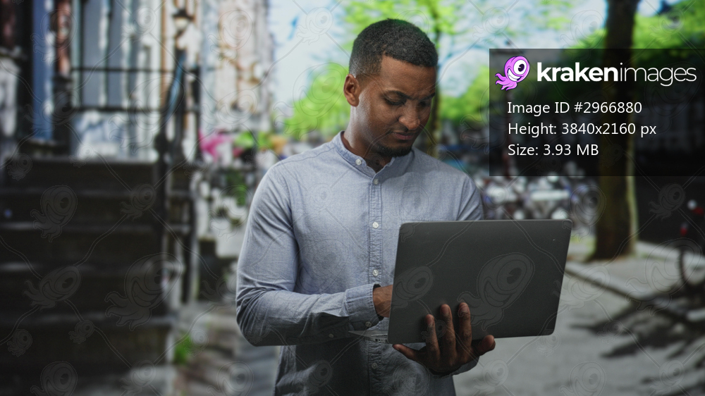 Young black man in button shirt holding laptop with one hand while clutching his side with the other, standing on a tree lined street near steps and bicycles; discomfort. - Kraken Images
