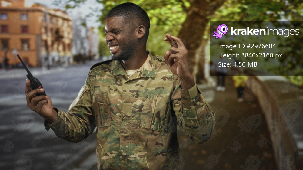 Young black man in camouflage uniform holds radio with fingers crossed on riverside stone promenade; hope duty.