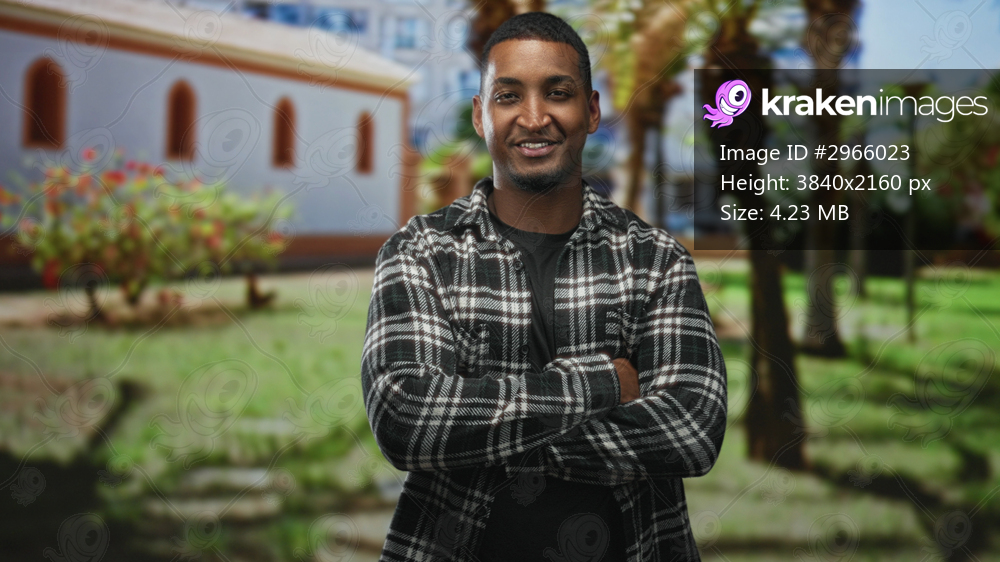 Young black man in plaid shirt with arms crossed and a soft smile, standing near palm trees and arched windows of a building; confidence.