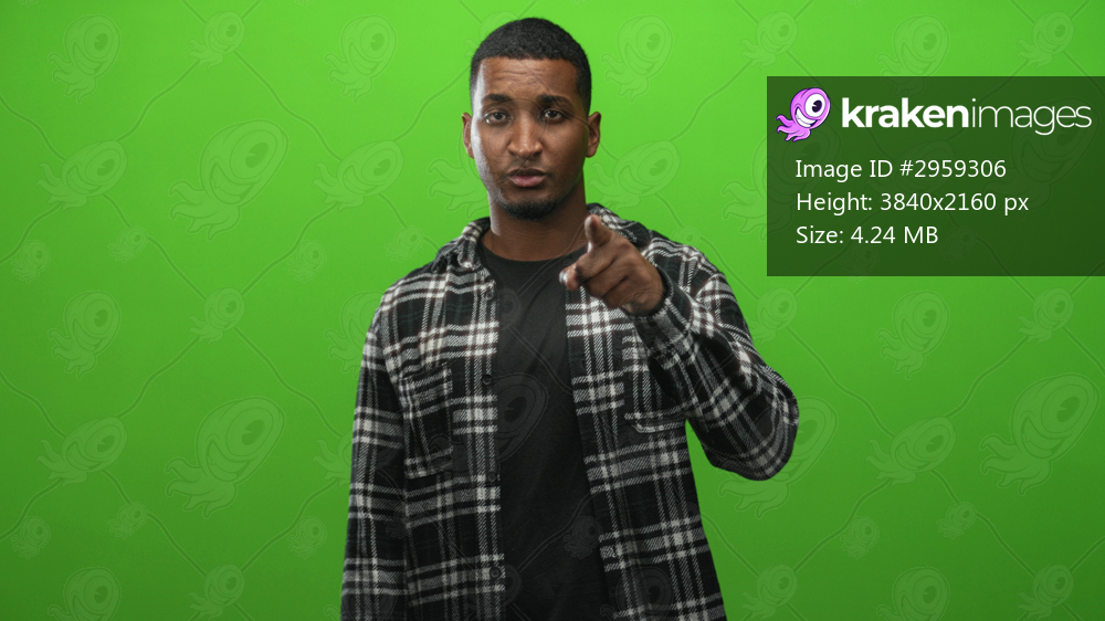 Young black man in plaid shirt points finger to camera in green studio, facing forward with slight head tilt; confidence direct address.